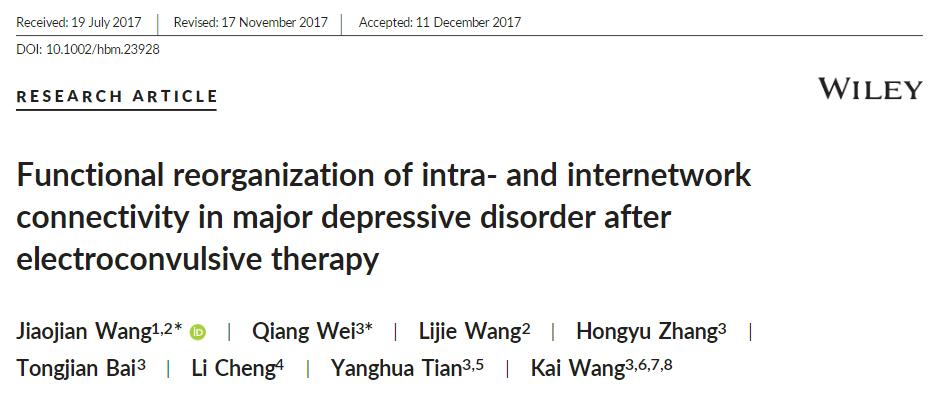 91热爆 院长汪凯教授、田仰华教授课题组联合中国电子科技大学王骄健教授课题组关于发现电休克治疗对抑郁症患者大脑网络的调节作用入选Human Brain Mapping高被引论文。该研究不仅发现电休克可调节网络内部的连接,亦可调节网络间以及重要节点间的连接,抑郁症患者经电休克治疗后症状的改善和这些网络的调节密切相关。该研究为理解抑郁症的机制、电休克治疗抑郁症的机制提供新思路。